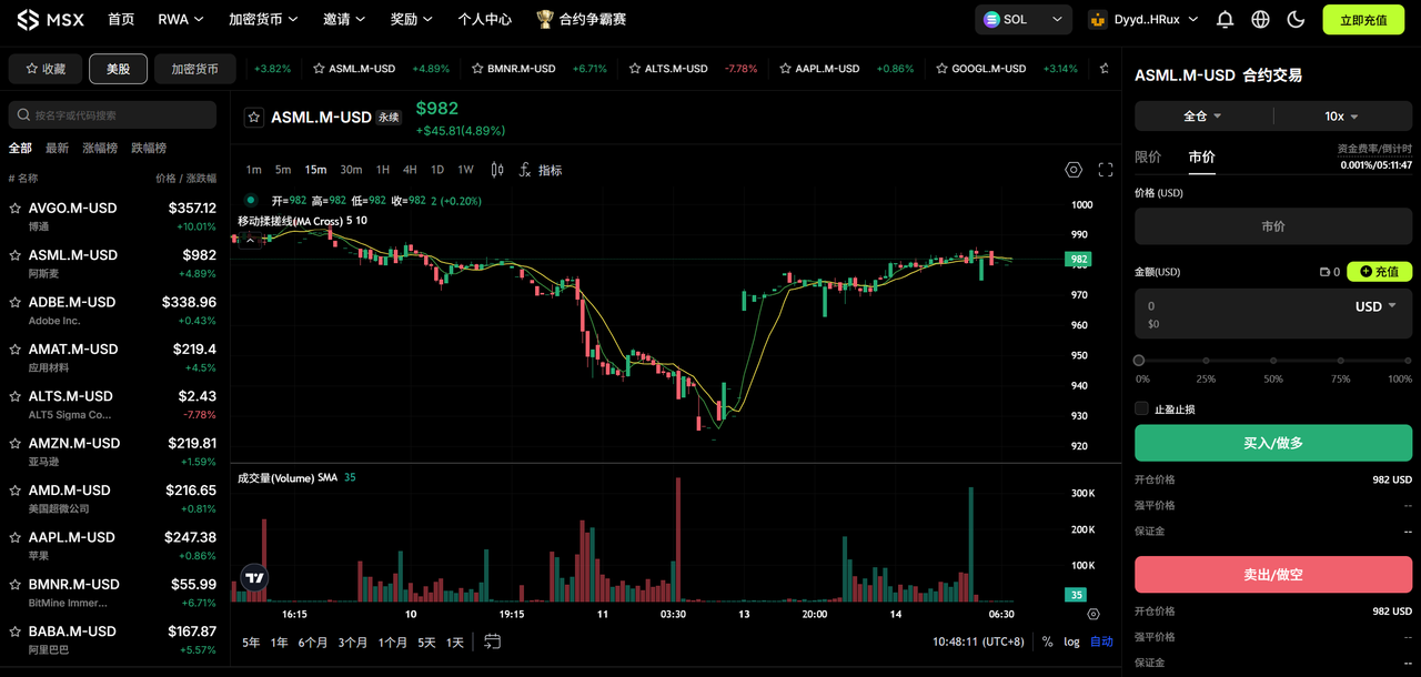 MSX 的合约板块(Futures)提供多倍杠杆与做多/做空功能,支持用户以更灵活的方式参与代币化美股资产的价格波动。