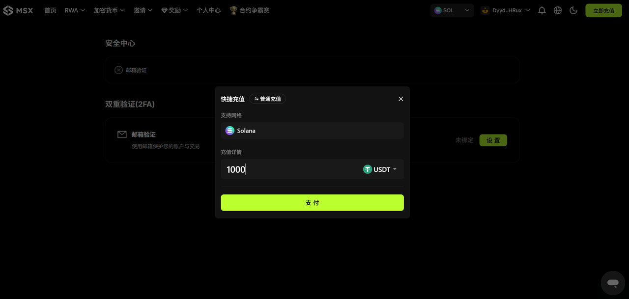 操作流程:填入具体充值金额,点击「支付」,系统自动调用链接 MSX 的浏览器插件钱包,只要钱包内有足够余额,确认后便可进行快速充值;