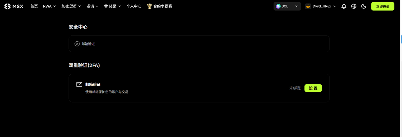 用户可在页面右上角点击钱包地址 → 选择「安全中心」 进入设置页面,然后在输入框中填写常用的电子邮箱(优先建议使用 Gmail、Outlook 等国际邮箱,避免拦截),点击「发送验证码」,系统会向你填写的邮箱发送一封验证码邮件。
