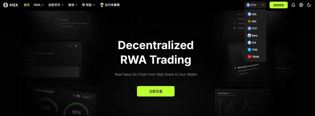 除了代币化美股之外,MSX 同样支持主流加密资产的链上现货与合约交易,用户无需注册或充值到托管账户,只要连接钱包,即可直接开始交易。