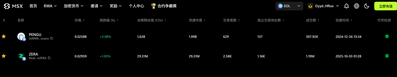 当你登录 MSX 时,系统会自动检测你当前连接的钱包网络(如 Solana、Ethereum、BNB Chain、Base 等),并根据该网络动态显示对应的可交易代币列表与行情界面,例如:
